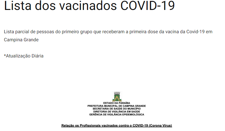 A prefeitura de Campina Grande passou a disponibilizar, através do site oficial do município, a lista de vacinados contra a Covid-19. A medida visa dar transparência ao processo de imunização, que nesse primeiro momento é direcionado para profissionais da área da saúde e idosos com mais de 60 anos que vivem em casas de acolhimento. A Rainha da Borborema recebeu na última terça-feira um total de 4.194 doses da vacina CoronaVac, o que é suficiente para imunizar 2.097 pessoas.