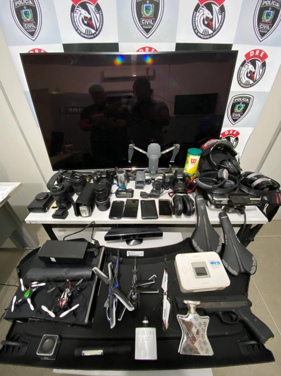 Do local, foram furtados um aparelho de TV, três câmeras fotográficas profissionais, lentes de câmeras, uma filmadora, microfone profissional, dois drones, quatro aparelhos celulares e duas celas de bicicleta.