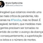 O prefeito de Campina Grande, Bruno Cunha Lima (PSD), se pronunciou, extraoficialmente, na noite desde sábado (6), após a divulgação da vigésima avaliação do Plano Novo Normal, que coloca Campina Grande e mais 210 municípios paraibanos em bandeira laranja, que assim como a vermelha (oito cidades) impõe medidas de restrições mais duras à população. Em linhas gerais, Bruno questionou o remanejamento da cidade para bandeira laranja quando a ocupação de leitos de UTI na Rainha da Borborema está abaixo de 50%, apesar de afirmar entender a situação de avanço da doença na Paraíba e no Brasil, bem como a necessidade da utilização de medidas mais urgentes para conter o avanço da doença.