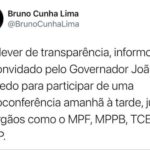 Bruno informou que neste domingo (7) à tarde vai participar de uma videoconferência com o Governo do Estado, Prefeitura Municipal de João Pessoa, Ministério Público da Paraíba, Ministério Público Federal e Tribunal de Constas da Paraíba.