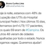 “Não se pode negar que, aqui em #Campina, desde o início de tudo, estamos fazendo todos os esforços para garantir tratamento público de qualidade e em quantidade suficiente para atender aos pacientes infectados pelo novo coronavírus. Basta ver os números da cidade. Hoje à noite, estamos com 48% de ocupação das UTI’s do Hospital Municipal Pedro I. Nos últimos 15 dias, internamos (enf+UTI) 117 pacientes, dos quais 69 eram de #Campina. Os outros 48 vieram de cidades espalhadas por todo o estado. Nunca negamos vagas. Queremos ajudar!”, postou o prefeito em uma rede social.