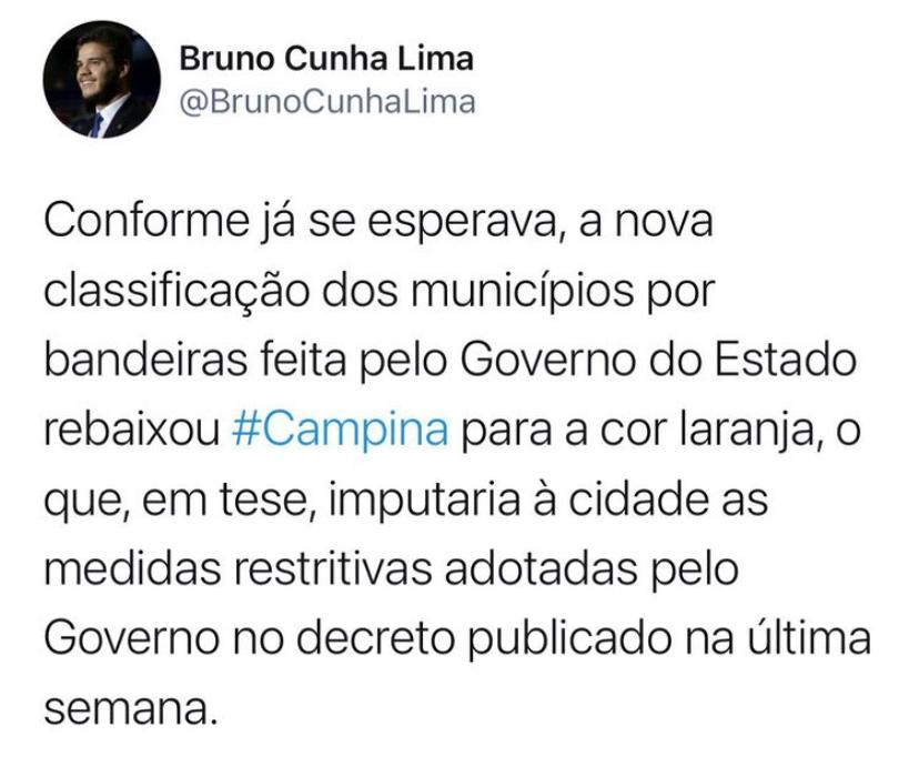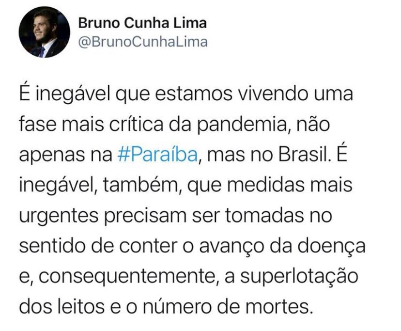 O prefeito de Campina Grande, Bruno Cunha Lima (PSD), se pronunciou, extraoficialmente, na noite desde sábado (6), após a divulgação da vigésima avaliação do Plano Novo Normal, que coloca Campina Grande e mais 210 municípios paraibanos em bandeira laranja, que assim como a vermelha (oito cidades) impõe medidas de restrições mais duras à população. Em linhas gerais, Bruno questionou o remanejamento da cidade para bandeira laranja quando a ocupação de leitos de UTI na Rainha da Borborema está abaixo de 50%, apesar de afirmar entender a situação de avanço da doença na Paraíba e no Brasil, bem como a necessidade da utilização de medidas mais urgentes para conter o avanço da doença.