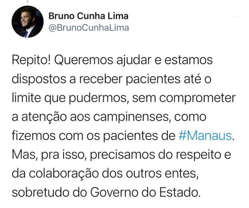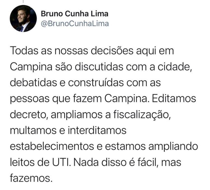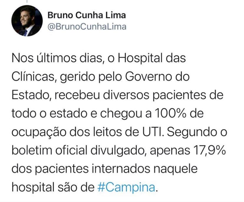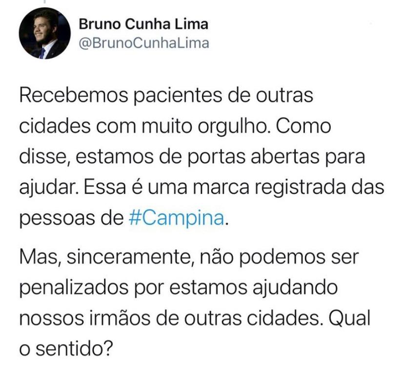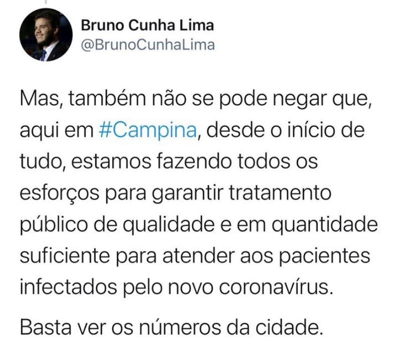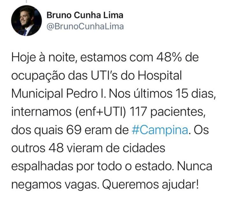 “Não se pode negar que, aqui em #Campina, desde o início de tudo, estamos fazendo todos os esforços para garantir tratamento público de qualidade e em quantidade suficiente para atender aos pacientes infectados pelo novo coronavírus. Basta ver os números da cidade. Hoje à noite, estamos com 48% de ocupação das UTI’s do Hospital Municipal Pedro I. Nos últimos 15 dias, internamos (enf+UTI) 117 pacientes, dos quais 69 eram de #Campina. Os outros 48 vieram de cidades espalhadas por todo o estado. Nunca negamos vagas. Queremos ajudar!”, postou o prefeito em uma rede social.
