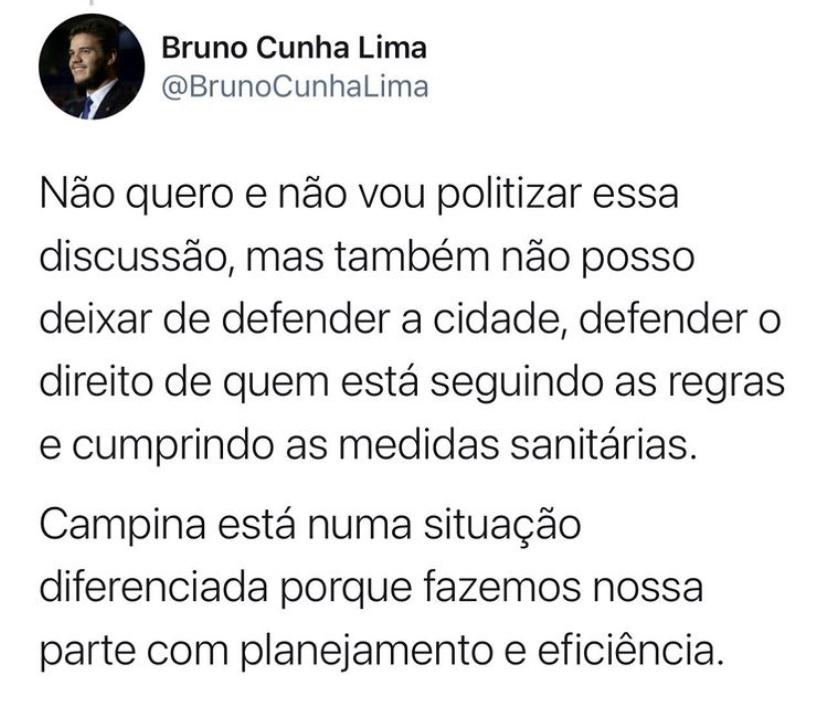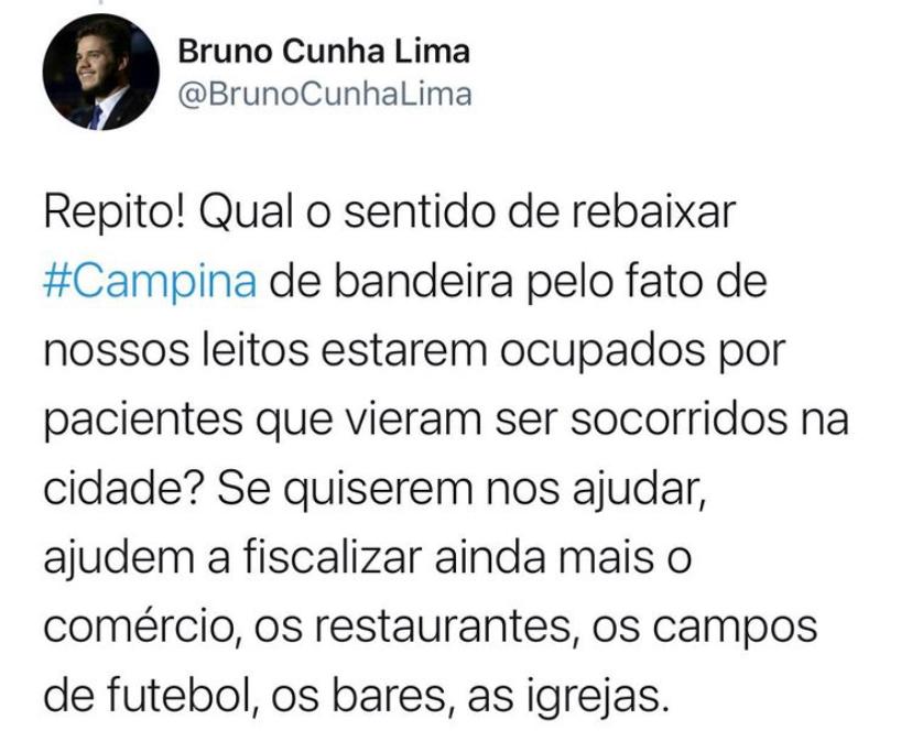 “Qual o sentido de rebaixar #Campina de bandeira pelo fato de nossos leitos estarem ocupados por pacientes que vieram ser socorridos na cidade? Se quiserem nos ajudar, ajudem a fiscalizar ainda mais o comércio, os restaurantes, os campos de futebol, os bares, as igrejas.”, afirmou.
