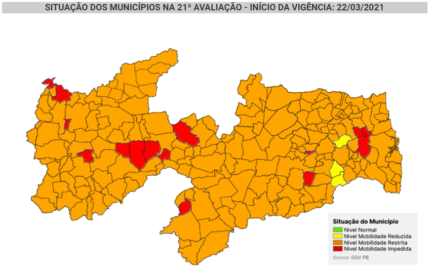 O Governo do Estado divulgou neste sábado (20) a vigésima primeira avaliação do Plano Novo Normal. E o que já era ruim, conseguiu ficar ainda pior. Quase dobrou o número de municípios em bandeira vermelha, a mais crítica. Na vigésima avaliação oito cidades estavam classificadas assim, agora são 15, número que corresponde a 7% dos 223 municípios paraibanos. Na bandeira amarela eram quatro municípios, agora são três: Mogeiro, Mulungu e Salgado de São Félix. O Estado continua sem ter nenhum município classificado na bandeira verde, a mais próxima do que consideramos normal.