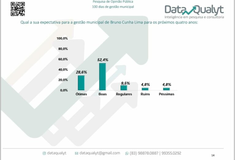 Na mesma pesquisa do Instituto Data Qualyt, 64,1% dos entrevistados apontam que a gestão de Bruno tem desempenho igual à do ex-prefeito Romero Rodrigues. 10,3% consideram melhor e 7,7% acreditam ser pior.