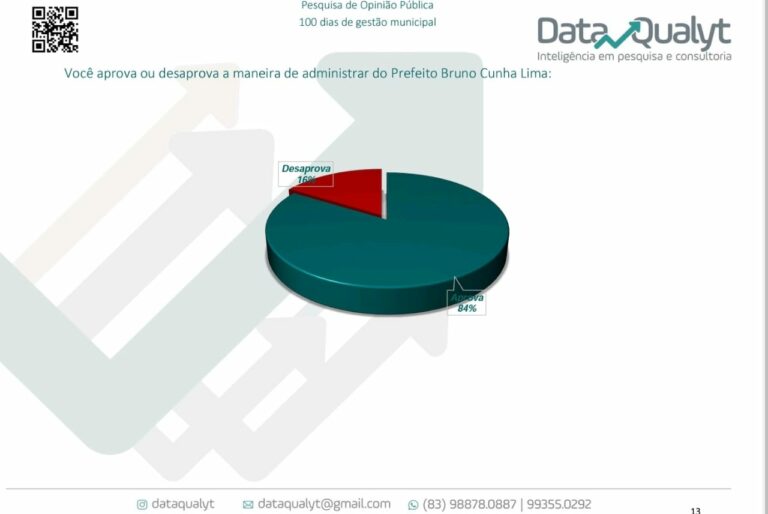 Pesquisa de opinião pública realizada pelo Instituto Data Qualyt, no período entre nove e 10 deste mês, em 35 bairros de Campina Grande, revela a aprovação de 74,4% da população à gestão do prefeito Bruno Cunha Lima, em plena pandemia. No mesmo levantamento, 84% aprovam a maneira de Bruno administrar e um percentual ainda mais impressionante em relação à expectativa dos entrevistados em relação ao governo nos próximos quatro anos: 87%.