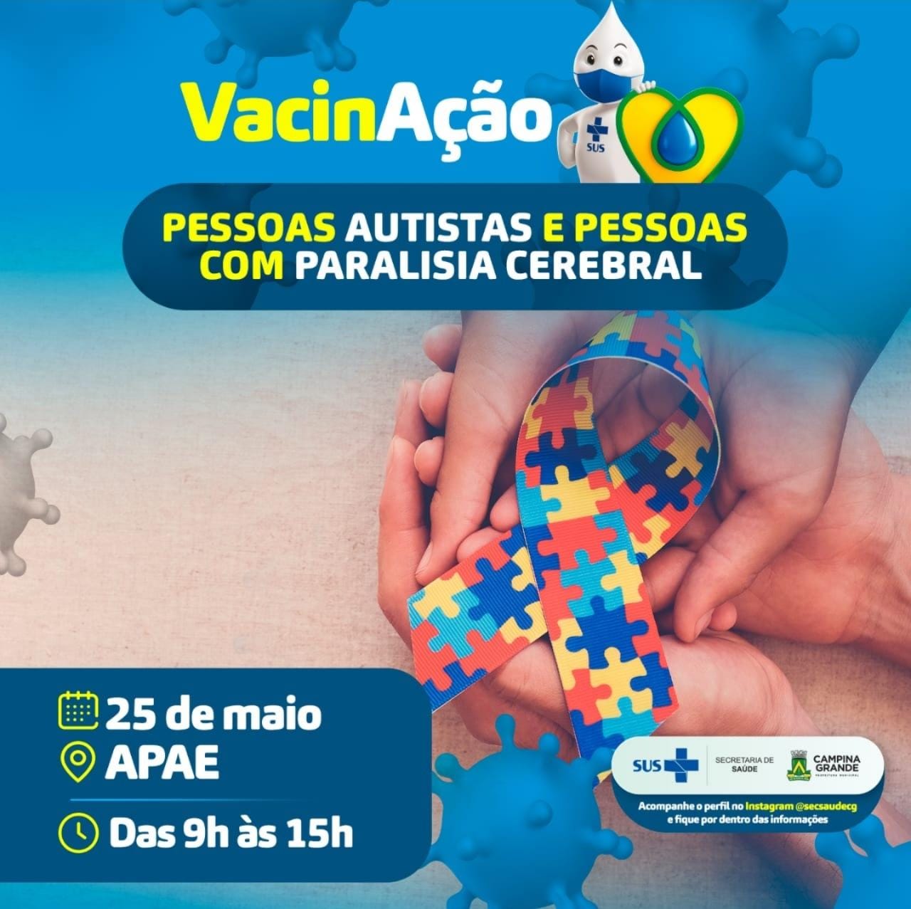 Pessoas com Transtorno do Espectro do Autismo e aquelas que possuem paralisia cerebral, receberão, nesta terça-feira (25), a primeira dose da vacina contra a Covid-19. A vacinação acontecerá de 9 às 15h na Associação dos Pais e Amigos dos Excepcionais (APAE), que fica no bairro do Catolé. É necessário levar laudo comprobatório da condição de saúde, além de documento oficial e cartão do SUS.