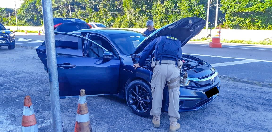 Os policiais abordaram o veículo, um Honda Civic, na BR-101, município de Alhandra. Após fiscalização minuciosa, foi verificado que se tratava de um veículo roubado no último sábado no município de Camaragibe, Pernambuco. O veículo já circulava clonado.