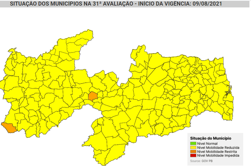 O Governo do Estado da Paraíba divulgou, na tarde deste sábado (7), a trigésima primeira avaliação do Plano Novo Normal. O levantamento aponta que 221 municípios estão classificados em bandeira amarela, uma das menos restritivas em relação a pandemia da Covid-19. Apenas duas cidades, Cacimba de Areia e Santa Inês, estão classificadas em bandeira laranja. Nesta avaliação, o Estado não tem cidades classificadas em bandeira verde e nem vermelha.