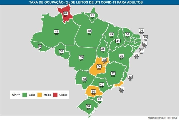 Duas capitais estão com taxas de ocupação de leitos de UTI Covid-19 superiores a 80%: Boa Vista (84%) e Rio de Janeiro (96%). João Pessoa está entre as 20 capitais fora da zona de alerta com a ocupação média de 16%, sendo menor que a do Recife (43%), Maceió (23%), Aracaju (45%), Salvador (26%). O estudo aponta que quatro capitais estão na zona de alerta intermediário: Belo Horizonte (64%), Curitiba (72%), Goiânia (73%) e Brasília (63%).