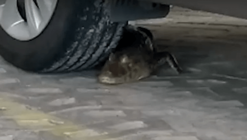 Os moradores acionaram a Polícia Ambiental assim que viram o jacaré, e se afastaram dele. Ainda de acordo com eles, o bicho ficou quieto e continuou debaixo do carro até a polícia chegar.