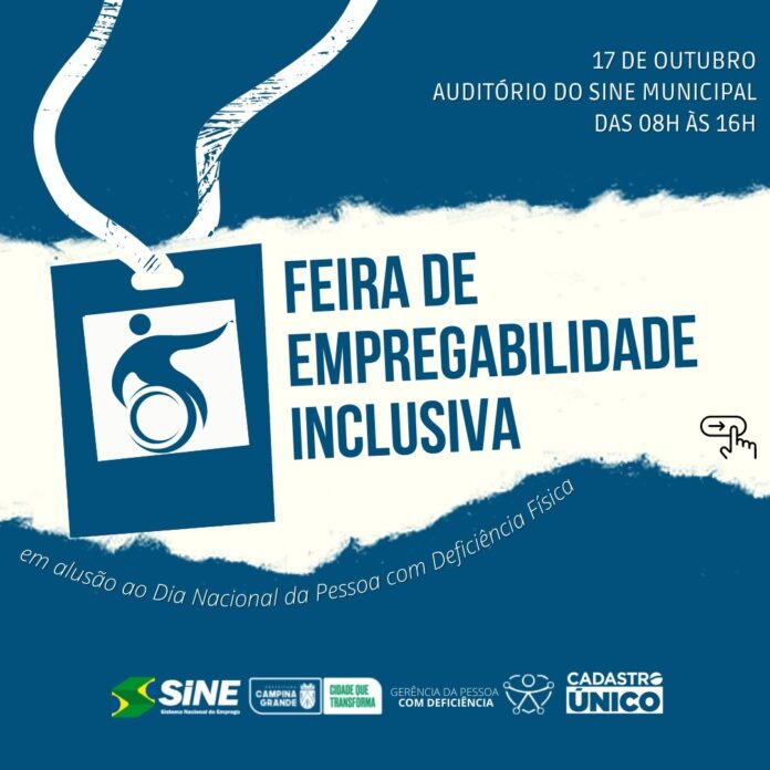 Na próxima segunda-feira (17), a Prefeitura de Campina Grande, por meio do Sine Municipal, em parceria com a Gerência da Pessoa com Deficiência, realizará a Feira de Empregabilidade Inclusiva. O evento acontecerá de forma presencial, no auditório do Sine-CG, localizado na rua Santa Clara S\N, Centro. A programação inicia às 8h e será encerrada às 16h, e acontece em comemoração ao Dia Nacional da Pessoa com Deficiência Física, celebrado nacionalmente no dia 11 de outubro.