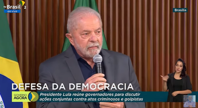 Lula disse que a reunião é inédita. “Estamos nos reunindo por uma causa mais nobre. Hoje estamos aqui, diferente do que eu imaginava, já que durante a campanha eu falava que ia reunir os governadores para discutir os temas mais importantes dos estados. Vocês vieram prestar solidariedade ao país e a democracia”, disse.