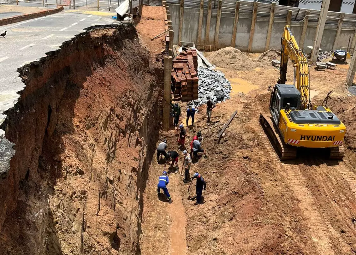 De acordo com moradores, a chuva encharcou a terra e provocou o deslizamento de parte do asfalto, que faz divisa com uma grande obra em construção há vários meses na cidade. Trabalhadores estavam na obra no momento do acorrido e felizmente ninguém se feriu.