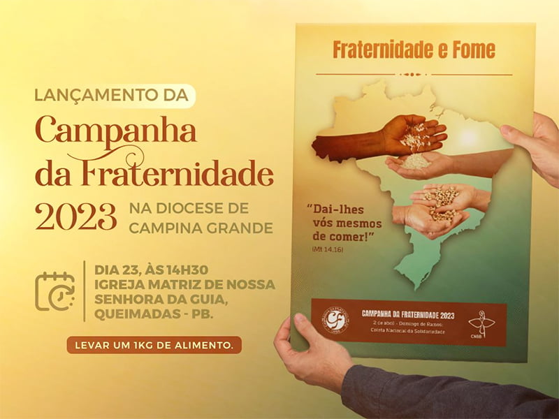 A diocese de Campina Grande se prepara para lançar nessa quinta-feira (23), a edição 2023 da Campanha da Fraternidade. Esse ano, o tema será “Fraternidade e Fome” com o lema “Dai-lhes vós mesmos de comer!” – Mt 14, 16. O lançamento acontece às 14h30 na Igreja Matriz de Nossa Senhora da Guia, na cidade de Queimadas.