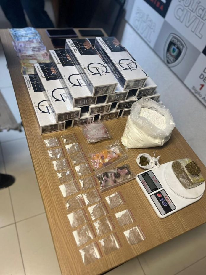 A equipe de policiais, no momento da abordagem constatou a veracidade dos informes, e flagrou o casal com diversos papelotes de cocaína, uma quantidade significativa de maconha, pinos e papelotes usados no tráfico, muitos aparelhos celulares, cigarros de origem ilegal e cerca de 3 kg de insumos para mistura de drogas, balança de precisão e dinheiro fracionado.