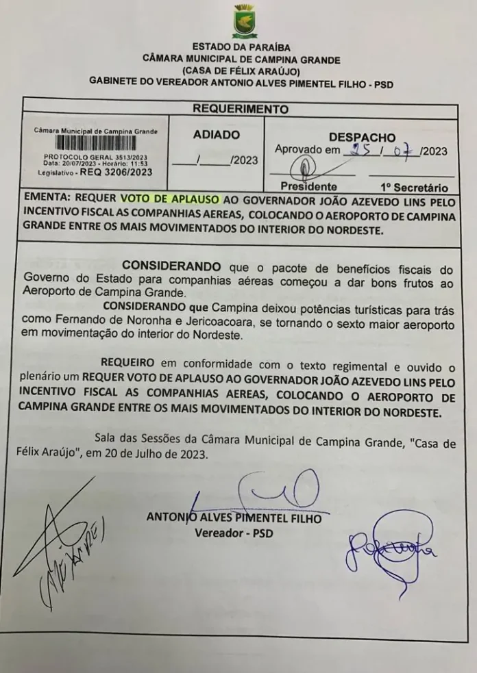 A Câmara Municipal de Campina Grande (CMCG( aprovou na sessão de terça-feira (25), por unanimidade, um voto de aplauso ao governador João Azevêdo (PSB), pelos incentivos fiscais concedidos pelo Estado para as companhias aéreas, o que possibilitou o aumento no número de voos no Aeroporto João Suassuna.