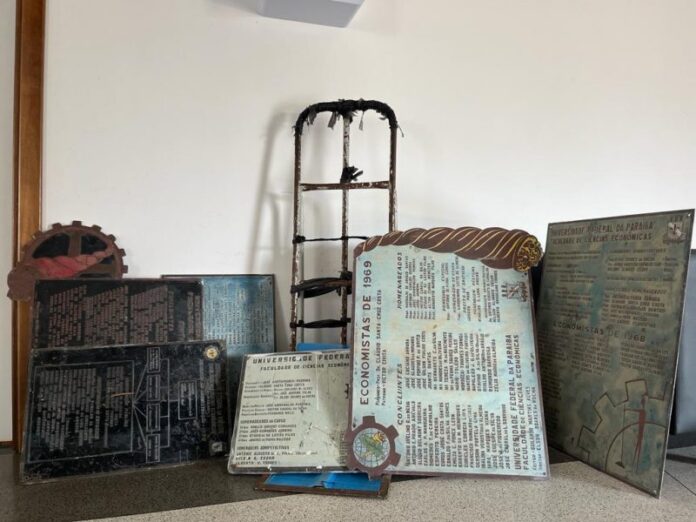 Eles confessaram que entraram na antiga Academia do Comércio, na Rua das Trincheiras, em João Pessoa, na madrugada de hoje, e retiraram as placas antigas de formandos da UFPB para comercializar. Uma das placas mostram a turma formada em Economia de 1969.