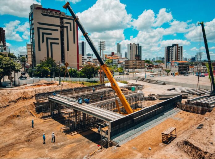 PARTIU PP – A Prefeitura de Campina Grande, por meio da Secretaria de Obras (Secob), está avançando rapidamente na obra de requalificação do Parque Evaldo Cruz. Nesta segunda-feira (4), iniciou-se a montagem das vigas pré-moldadas na estrutura dos pilares. O objetivo é que a equipe monte mais de 12 peças por dia, abrindo caminho para a conclusão do projeto e interligando completamente o Parque Evaldo Cruz ao Parque do Povo.