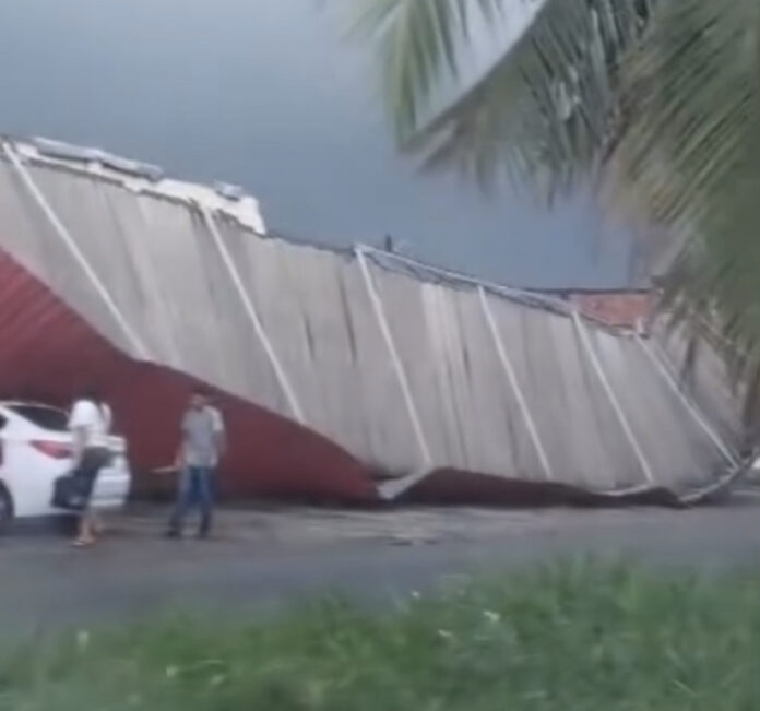 Supermercado “Aquarius” tem a fachada completamente destruída após fortes chuvas com vento, na madrugada desta sexta-feira (15), no bairro das Indústrias, em João Pessoa. Não há registro de feridos.
