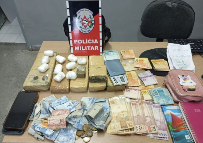 Foram apreendidos quase 3kg de maconha, “5.600 reais”, entre outros.