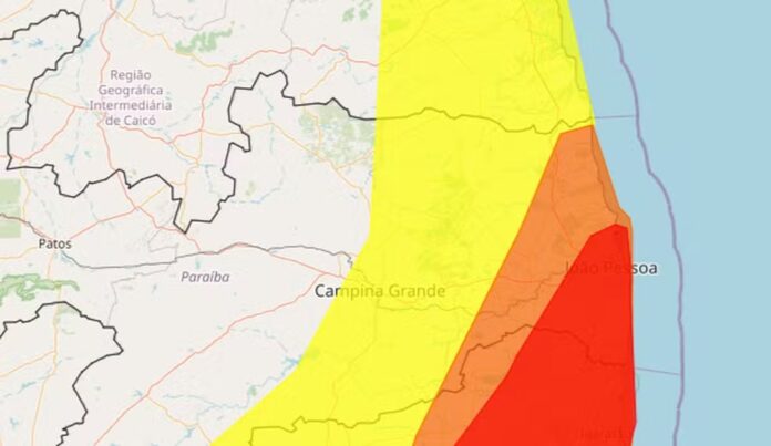 O Instituto Nacional de Meteorologia (Inmet) emitiu, na manhã desta quarta-feira (21), um alerta vermelho de grande perigo devido ao acumulado de chuvas para 12 municípios da Paraíba. O órgão também divulgou alertas laranja e amarelo, que abrangem outras regiões do estado, com diferentes níveis de risco.
