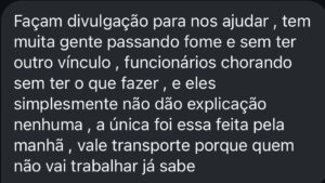 “Tem muita gente passando fome e sem ter outro vínculo. Funcionários chorando, sem saber o que fazer, e eles simplesmente não dão explicação nenhuma. A única coisa foi pela manhã, pedindo para a gente pegar o vale-transporte, mas o salário mesmo, nada”, relatou.