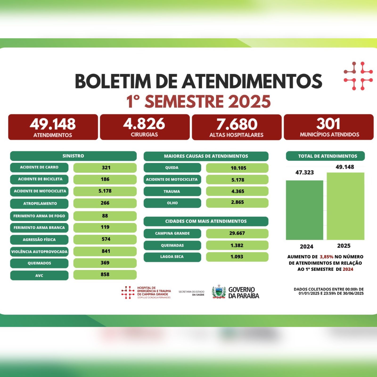 De janeiro a junho deste ano, o Hospital de Emergência e Trauma, em Campina Grande, realizou 49.148 atendimentos e 4.826 cirurgias. Os números representam um aumento de 3,8% no número de atendimentos em relação ao primeiro semestre de 2024.