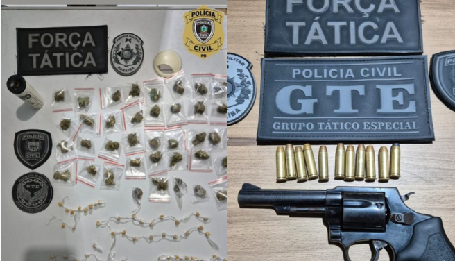 De acordo com a investigação, os agentes cumpriram mandados de busca e apreensão em dois imóveis que funcionavam como pontos de venda e depósito de entorpecentes. No local, foram encontradas drogas, balanças de precisão e materiais usados para o preparo e embalagem das substâncias.